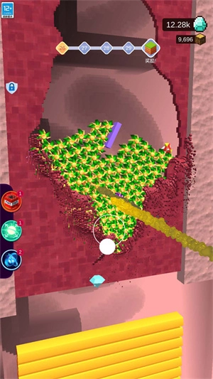 1、快乐挖掘:提供多种钻头和方块,玩家在关卡中不断向下挖掘,享受粉碎方块的快感。