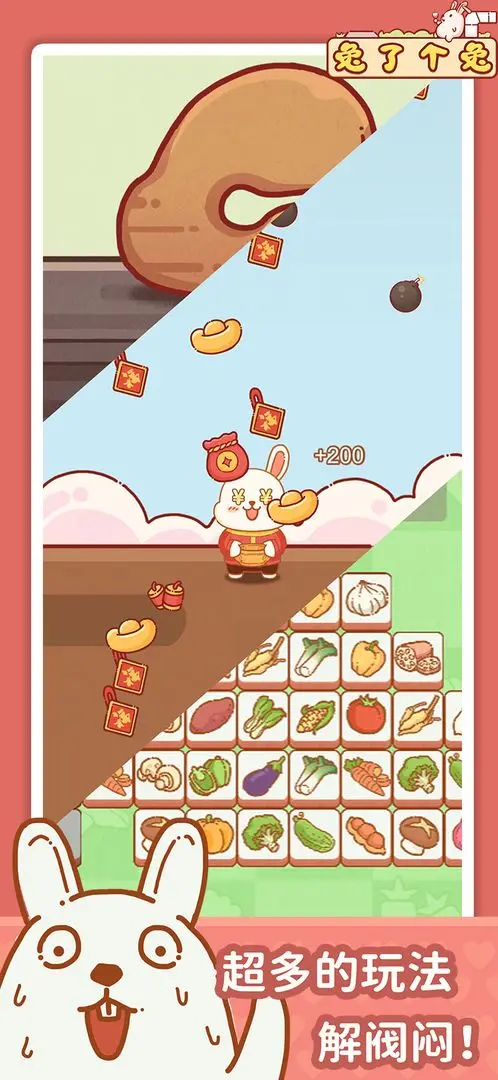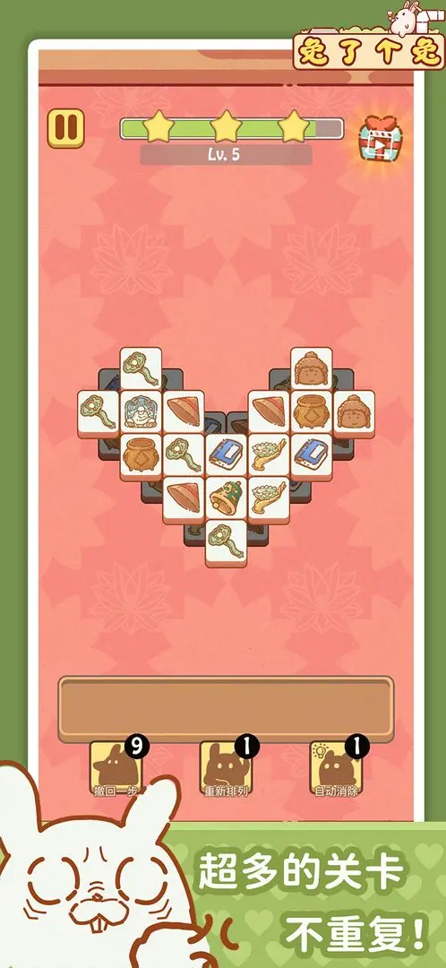 1.《兔了个兔》是一款集休闲与益智为一体的三消类游戏。玩家需消除图案相同的牌组来完成关卡挑战,关卡越往后,游戏的难度系数也会随之提升。想要快速通关,合理运用各类道具是至关重要的诀窍。