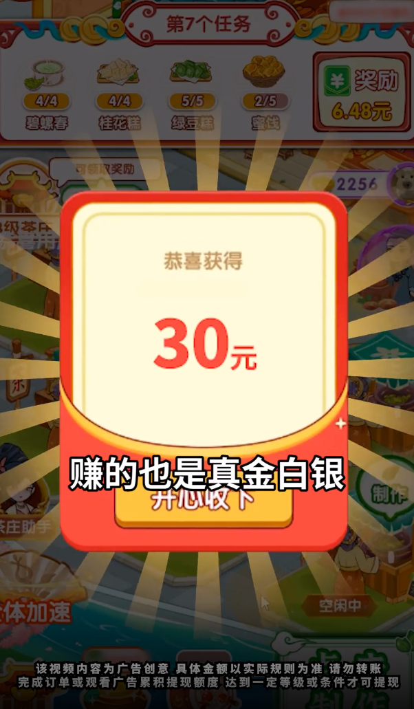 2、作为一款成熟的轻量级经营类游戏,其玩法和常见的“3毛小游戏”相似,奖励规则十分明确:观看广告视频大约能得到2元奖励,完成订单任务还能再赚取2-3元,平时清理茶摊灰尘时观看视频也会有额外红包出现,任务难度处于适中水平,适合利用碎片化时间来体验。