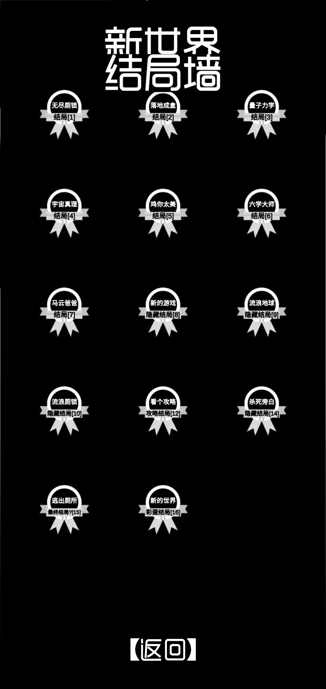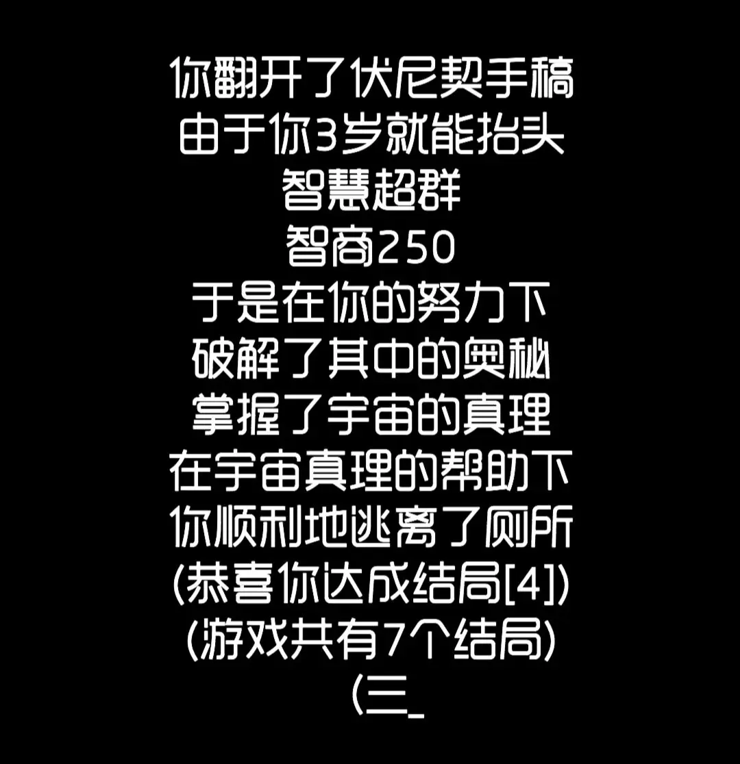 终点处有这部手机和马桶,为了以防万一,记得踩一下手机屏幕;要是想回去,触碰马桶听到冲水声就可以了,之后去结局墙查看,就能找到第十六个结局“新世界”啦~