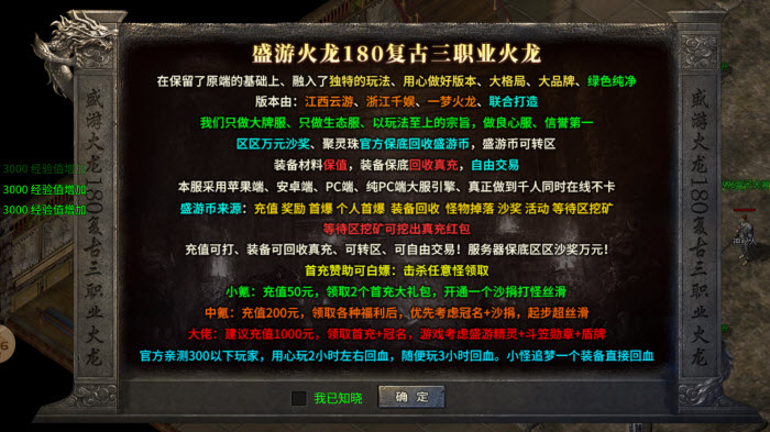 5、本服特色:充值也能打、所有全靠打、小怪爆所有、装备材料自由交易,聚灵珠保底回收。