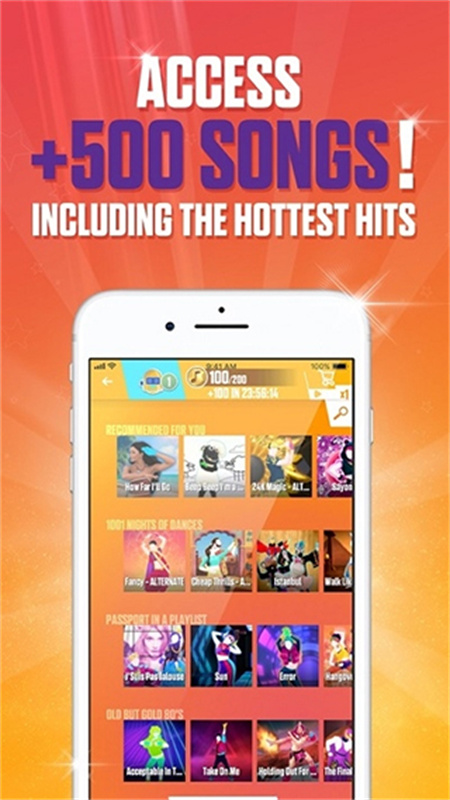 从500多首曲目的曲库中挑选一首歌曲,右手握着智能手机,跟着屏幕上的教练做动作!游戏会追踪并评分你的动作,所以好好打磨这些动作,争取拿到满分吧!