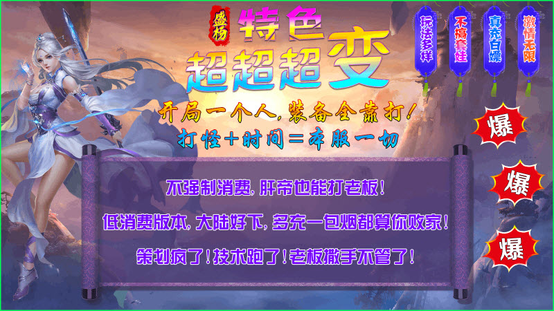 盛杨超超超变,属性堪称离谱,上线即赠切割,刷怪体验拉满,绝非秒杀流。各类酷炫霸气的装备武器均可通过打怪获取,海量游戏地图与副本等你探索,只要肯投入时间就能集齐所需物品,对散人玩家十分友好,零氪也能顺利通关,非常值得长期沉浸体验。