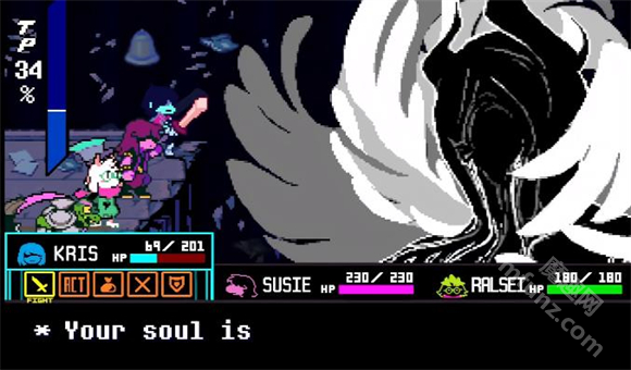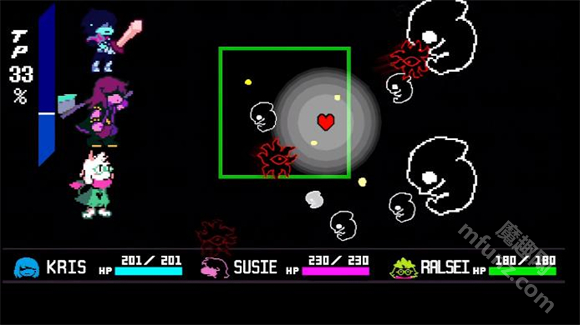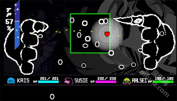 5、当第一次击败boss后boss会进入恢复阶段,这个阶段可以随便打,boss是不会掉血的,等boss恢复完毕后会进入剧情,剧情结束后会绿龟先生会加入战斗,此时需要将Kris扔进泰坦中心位置就可以进入剧情结束战斗。
