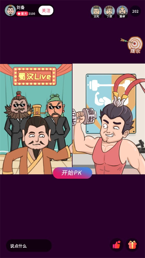 先点击“开始PK”,接着打开右下角的礼物界面,然后送出礼物,争取让分数超过吕布。