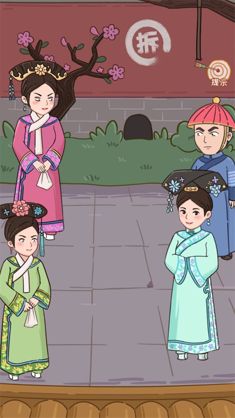 这款游戏的玩法十分简单,玩家需要借助场景里的人物与物品来解开正确的谜题。以甄嬛传关卡为例,玩家首先要点击墙上的洞,把欢宜香拖给穿红色衣服的女子;之后再次点击那个洞,将木棍拖到有缺口的地板上,就能获得一把梳子;接着把梳子拖给男子,拖动他的衣服在拆字处左右擦拭,直到衣服变白;最后把树枝上的绳子拖给男子,再点击左下角的女子,她就会被吓到,这样就能顺利过关了。除此之外,这款充满趣味梗的游戏中还有许多不同的关卡等着玩家们自行体验!