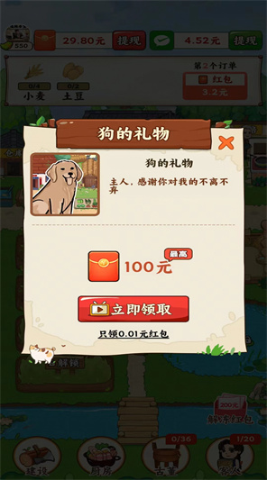 1、有许多红包可以让玩家去领取,完成的订单越多红包越多。