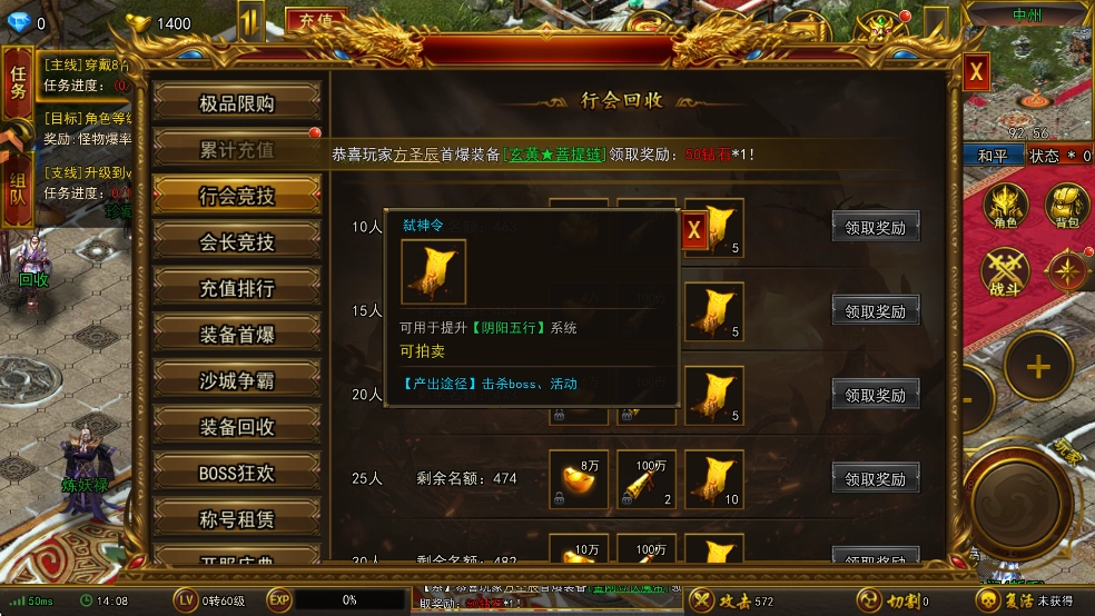 6、弑神令:所有怪物均有几率掉落弑神令!回收装备同样能获取弑神令,回收高级装备还可得到极品弑神令!该道具可用于提升阴阳五行系统等级!
