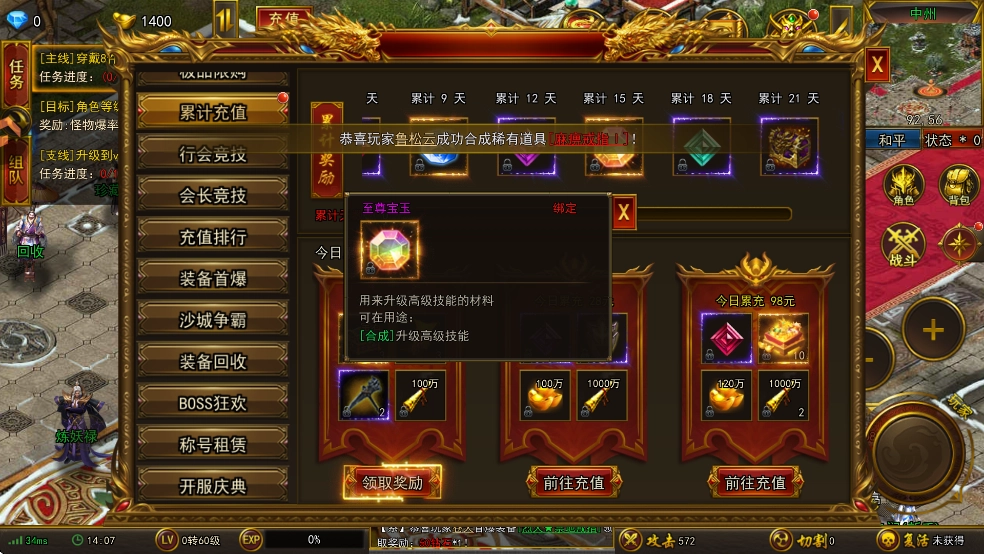 8、宝石:每日充值和累计充值的奖励里都能拿到极品宝石!参加通天塔活动会产出随机宝石袋,打开后有机会获得极品宝石!