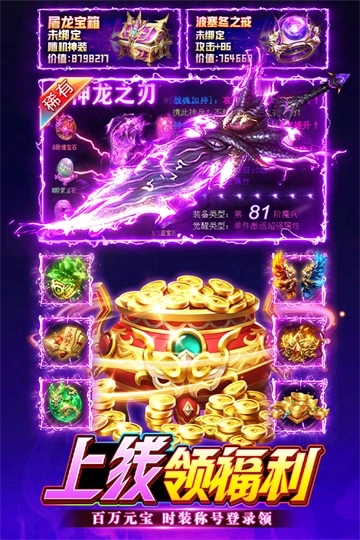 6、登录就能领取称号和时装,还有超高概率获取极品装备!法宝、神兵免费掉落,惊喜不间断!
