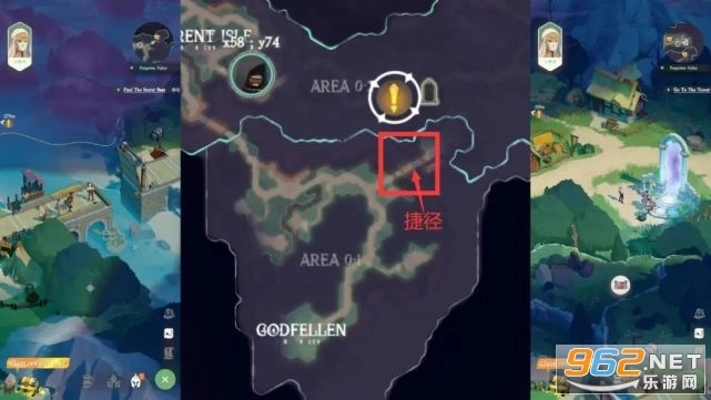 更令我感到意外的是,地图里还设计了捷径:在0-2地图后期拉下吊桥,玩家就能快速回到0-1地图的中期区域。没错,就像你猜测的那样,世界地图初次探索时没有自动寻路功能(解锁迷雾后,点击图标即可寻路到能到达的地点),玩家除了手动移动之外,还能借助一些固定的传送门在各个大区之间传送。