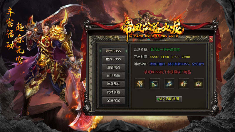 火龙版传奇,不仅画质高清,场景也带着复古韵味。在这里,你能体验到全新的游戏内容与独特玩法,只要肯花时间探索地图,就能获取自己所需的一切资源。而且每张地图都设有专属BOSS,其掉落爆率更是相当高。