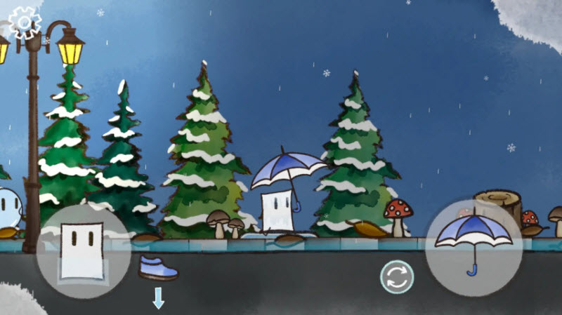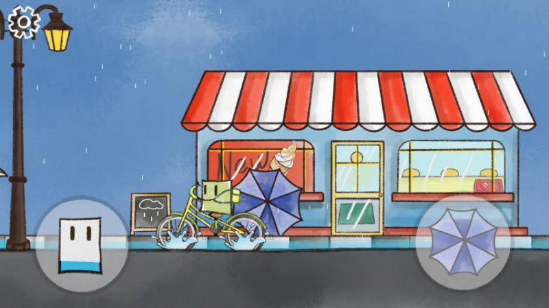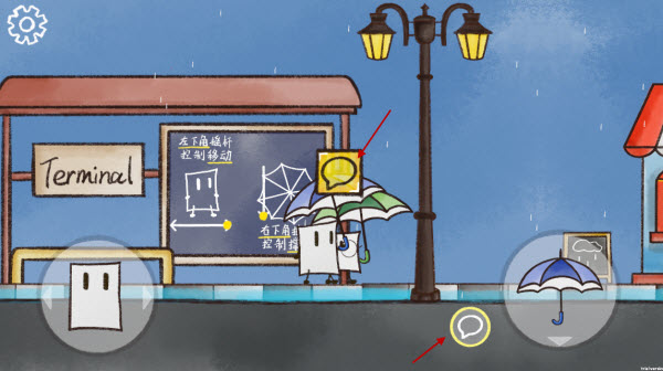 3、在关卡中,可通过左下角的摇杆操控移动,右下角的摇杆则用于操控撑伞动作。