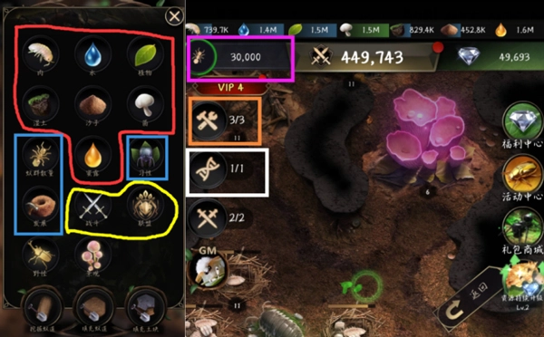 这里是提供各类建筑的区域,涵盖生产、军事、科技等不同类型,其中资源类建筑对应下图的红色圈选部分,军事类建筑对应黄色圈选部分,科技类建筑对应蓝色圈选部分。需要重点关注的是蚁群数量(紫色框选)、工蚁数量(橙色框选)以及进化菌丝(白色框选)这几项内容。