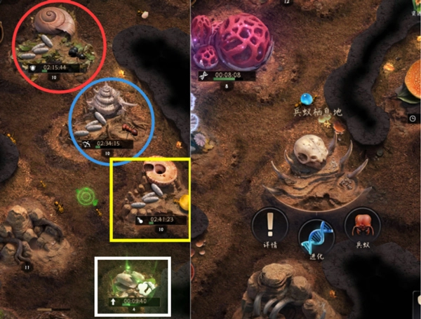 兵种孵化需要近卫蚁孵化地(红色圈)、射手蚁孵化地(蓝色圈)、运输蚁孵化地(黄色框)、结茧介质(白色框)以及兵蚁栖息地。