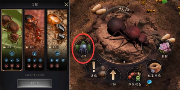 ⑨习性选择可根据自身情况决定:偏好掠夺玩法的玩家可直接选择掠夺习性;倾向挂机玩法的玩家,则可在畜牧和种植中任选其一。其中,畜牧习性更适合无法频繁登录游戏的玩家,有助于提升蜜露产量并减少进食区的资源消耗;种植习性则适合借助资源加工地定期产出各类资源,同时配合兵蚁外出采集来提高采集速度,从而实现快速发展。