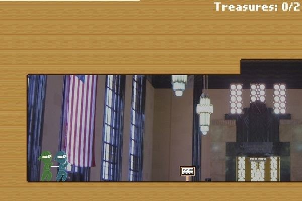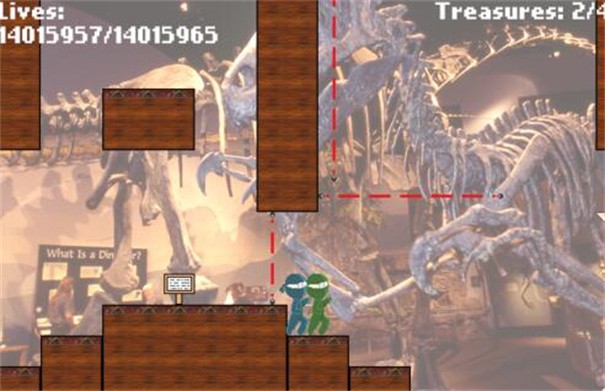 用空格进入第一个门后就是恐龙馆了。起点下方藏着一个宝物,还是老办法:要么一人趴下、一人荡下去,要么荡到左边的墙壁上,慢慢爬到宝物旁边再一跳就能拿到。