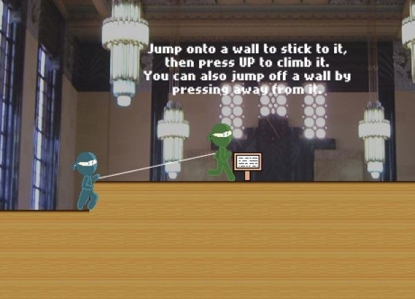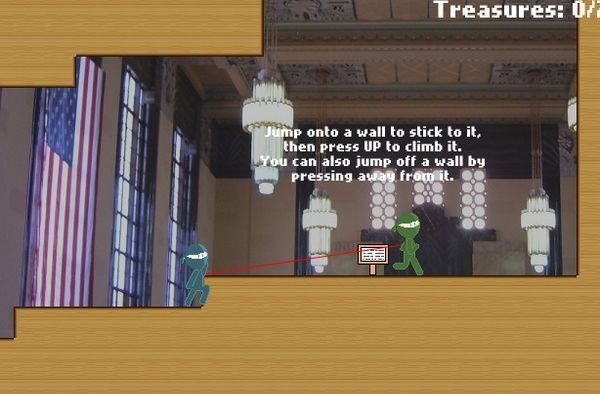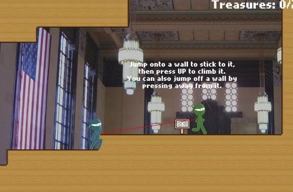 然后向右走绕过柱子,就能到达最后一个宝物所在的位置。接着顺着柱子往上爬到最顶端,过去的时候切记不要跳得太高,拿到宝物后直接往回走,到门口按空格键,这一关就完成了。
