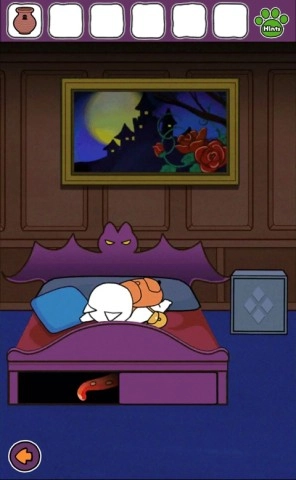 接下来回到最初的房间,查看两侧石雕底部的小柱子,从中寻找提示;之后返回挂有吸血鬼画像的房间,用墨水将密码箱上的对应位置染色。谜团很快就要解开了。