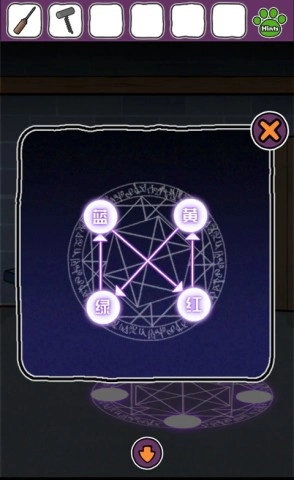 先记住花瓶上的颜色分布情况,接着向右查看魔法阵,再结合之前“从蓝到蓝”的提示,就能推导出密码顺序是左、上、下、右、左,按此操作即可完成解码。