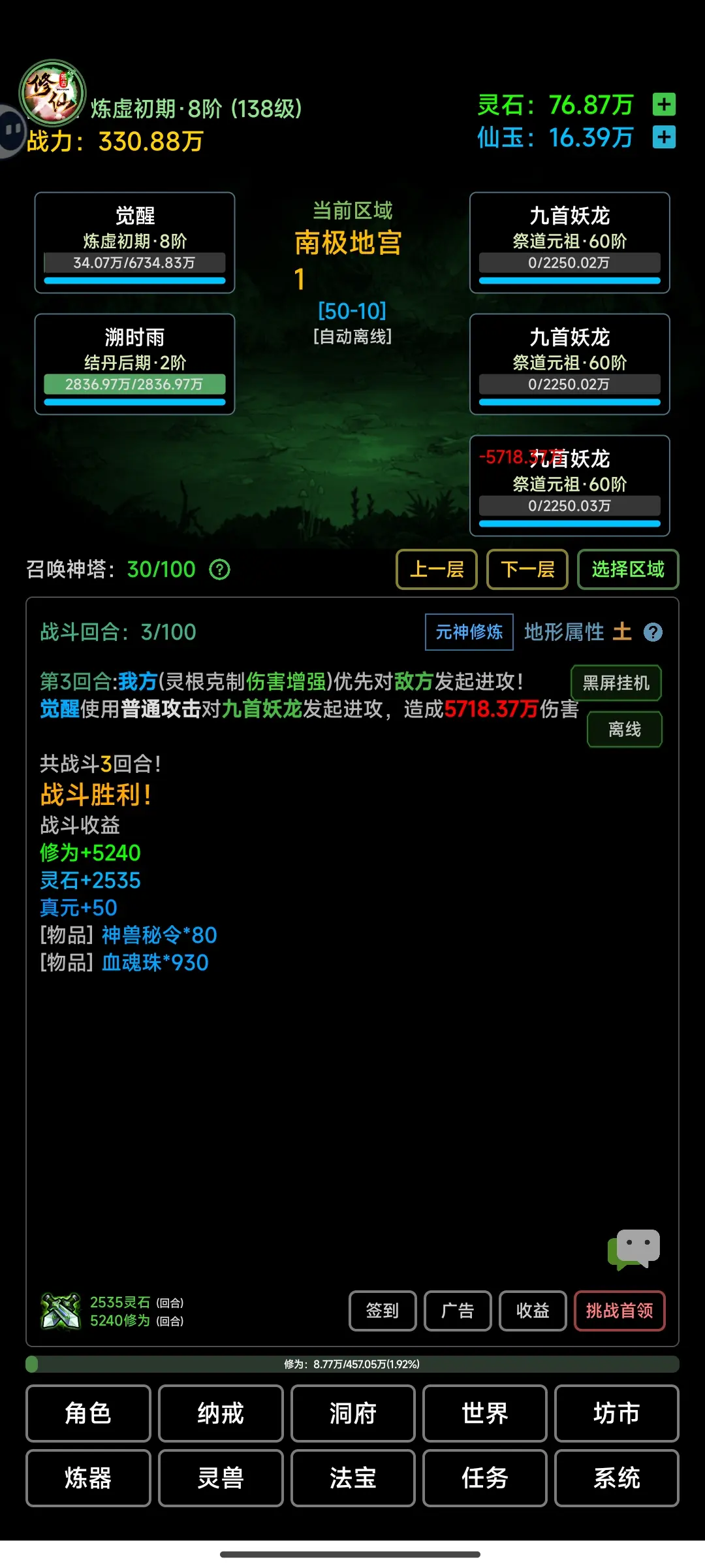 4、到筑基中期了把自动升级打开,一直挂1图9,一轮330修为,1分钟差不多23轮怪。一段时间去看下能不能秒2图2,如果可以了,可以挂一会收一套套装,一套装备气血加成40%,然后继续挂1图9。(2图9能秒的话430*16轮)