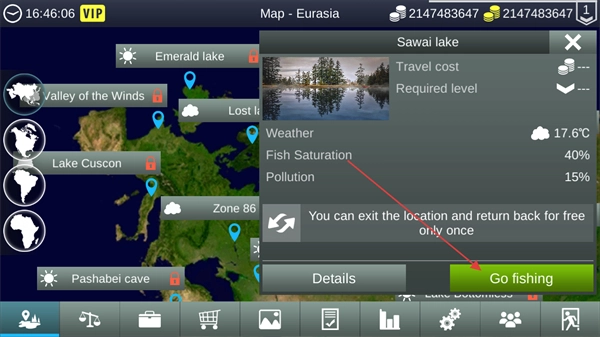 1、在Map-Eurasia界面选择Sawailake,查看其Weather、FishSaturation等信息后,点击Gofishing即可进入该湖泊的垂钓场景。