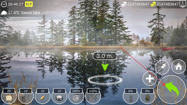2、进入Sawailake垂钓界面后,观察当前垂钓深度为3.0m,点击右侧对应按钮可进行抛竿操作。