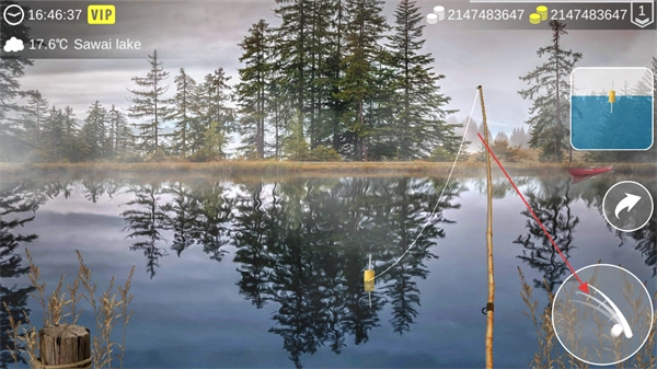 3、抛竿后观察浮漂状态,当浮漂出现异动时,点击右侧对应的操作按钮,即可触发提竿动作尝试捕获鱼类。
