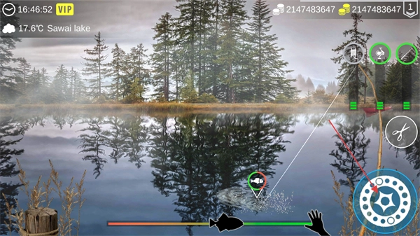 4、当鱼咬钩后,通过操作右侧的转轮按钮来控制收线节奏,同时留意鱼类的挣扎状态,稳定收线以成功钓获目标鱼。
