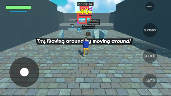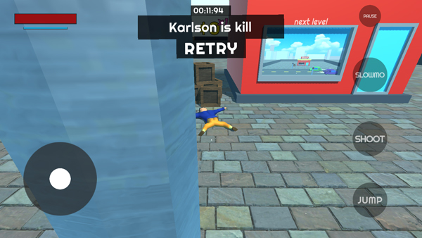 5、进入游戏后的界面如图所示,屏幕左侧的按键用于控制移动,右侧则分布着攻击、跳跃等功能键位。只要成功操控卡尔森抵达商店,就能顺利进入下一关。