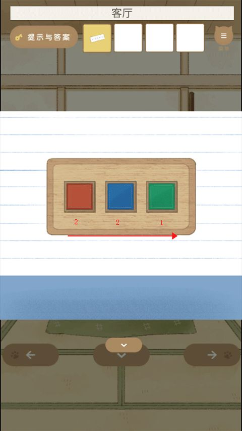 3、把两个【纸条】合并,得到线索:红红蓝蓝绿;接着到(客厅)点击柜子,按照从左到右的顺序按下按钮,其中红色按钮按2次,蓝色按钮按2次,绿色按钮按1次。