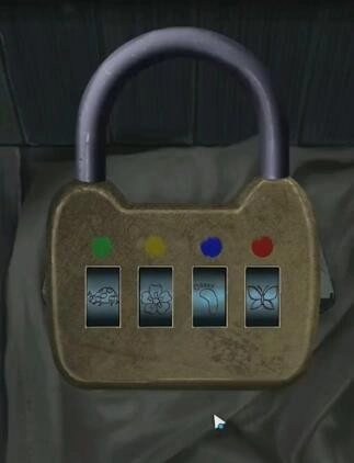 屋里右侧柜子解谜如图,可以获得照片以及胶带。