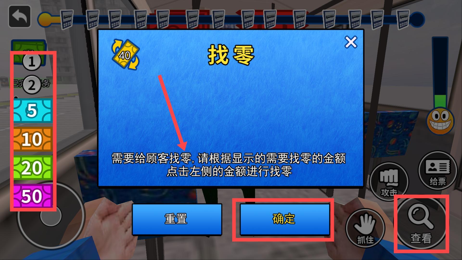 当需要进行找零操作时,请依据具体金额在左侧选择对应的纸币,点击确定按钮即可完成找零流程,操作过程中可以利用查看功能来辅助完成。