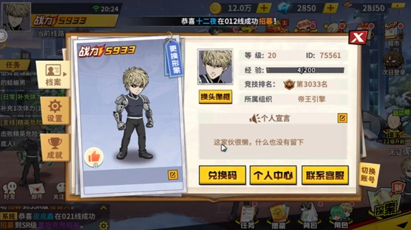 1、首先打开一拳超人最强之男手游,进入游戏后点击左上角头像;