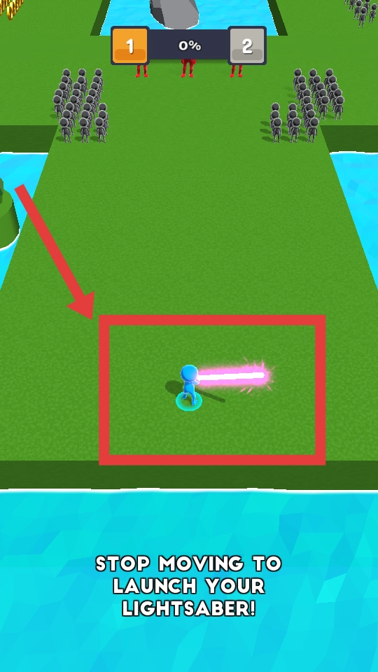 进入游戏关卡后,操控手持粉色光剑的蓝色角色,根据界面提示,在停止移动时释放光剑攻击,以应对前方即将出现的敌人。