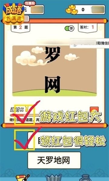 成语大满贯真的能赚到钱吗?成语大满贯支持提现吗?那就来玩正版的成语大满贯游戏吧!登录游戏就能领取现金红包,每一关对应一个成语,答对就能获得红包奖励,通过几关后还能参与抽奖活动。要是零花钱不够用,就赶紧来玩成语大满贯吧!
