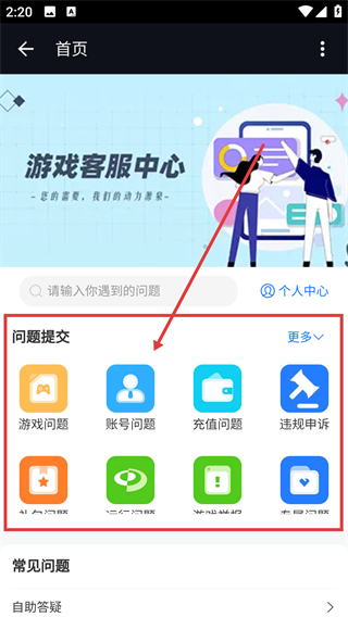 在客服中心页面的【问题提交】板块,你可以选择【游戏问题】【账号问题】等分类,然后提交相应的咨询内容。