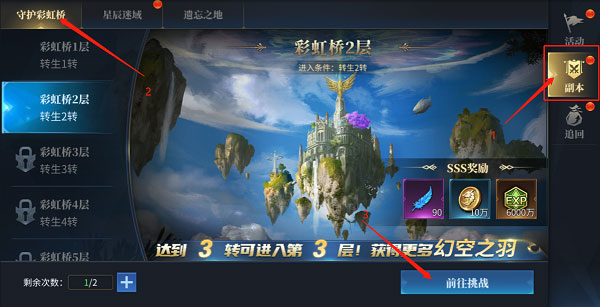 彩虹桥共设有10层,提升转生等级能够解锁更高级别的副本地图,进而获得更丰厚的奖励。每天拥有2次免费挑战机会,挑战次数还可以额外购买。
