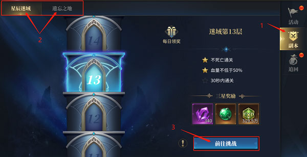 星辰迷域是获取技能升级材料的主要途径,依据最高通关层数,每日还能领取源石与丰厚经验。遗忘之地则产出大量强化水晶,能助力我们快速提升战力,需留意每日有2次免费挑战机会(可额外购买次数),是每日必刷的副本。