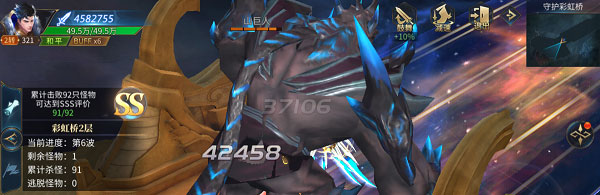 彩虹桥将迎来6波怪物的冲击,最后一波会出现最终Boss,成功击败它就能得到丰厚的材料奖励。要是战力不够拿到SSS评价,导致部分奖励损失的话,可以点击界面上方的“鼓舞”按钮,消耗金币或钻石来提升副本内的攻击力,以此阻止怪物逃脱。