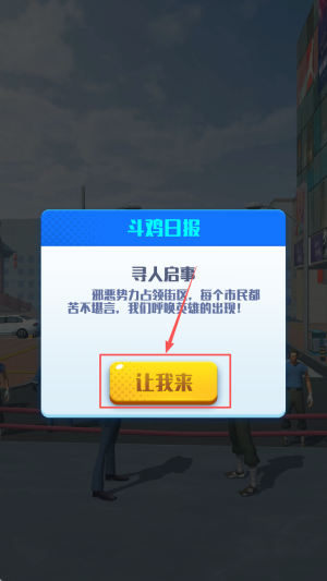 1、接受任务:进入游戏主界面后,找到并点击“让我来”按钮,即可承接斗鸡日报发布的寻人启事相关任务。