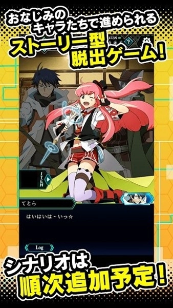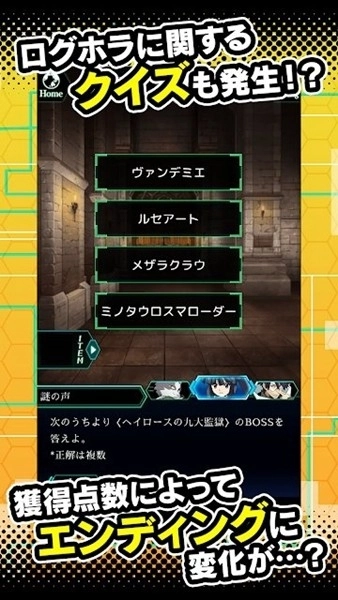 记录的地平线也叫ログホラ脱出是一款根据同名动漫作品制作的冒险逃生游戏,玩家需要从各种场景中逃脱,必要时还需要战斗。整个游戏的走向是跟随剧情发展的,玩家只需要跟着剧情的选择就可以逃脱,不过故事不一定只有一个结局,如果玩家不慎重选择就有可能走向坏的结局。
