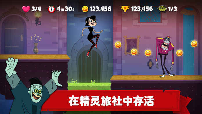 《精灵旅社探险》是一款欧美卡通风格的跑酷冒险游戏,拥有趣味十足的玩法,十分考验玩家的敏捷能力。在不同关卡中完成挑战的同时,还能收集金币解锁各类角色,还在犹豫什么?快来体验吧!