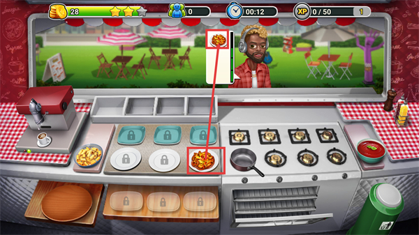 3、将准备好的【餐食】对应拖入顾客需求栏的目标位,完成餐品配送的关键步骤。