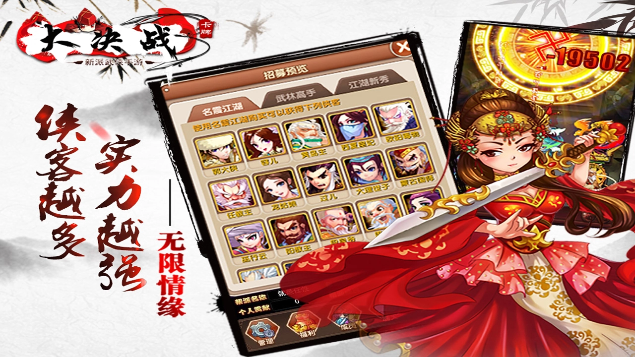 原汁原味的东方武侠题材,上百个经典场景和人物,放置、卡牌、挂机、策略等高自由度玩法任你选。