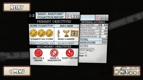 这款休闲游戏融合了哥特式风格与幽默元素,既考验智力又注重闯关体验。其玩法和经典游戏《愤怒的小鸟》十分相似:玩家只需拉动骷髅的头骨盖将其掀开,接着朝目标方向用力向后拉动,松手后骷髅便会连头带脑飞出去。在这里,连接脑与头骨的神经就像是《愤怒的小鸟》里的弹弓,头骨盖则对应着游戏中的小鸟。玩家要借助飞出的头骨收集金币、躲避各类障碍物,最终完成关卡挑战。不过得小心周围那些还“活着”的家伙哦!