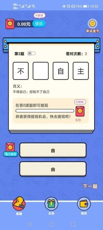开心猜成语红包版最近推出的闯关活动能让玩家赢取海量金币,还能解锁各类道具,为你提供更多提示助力答题。