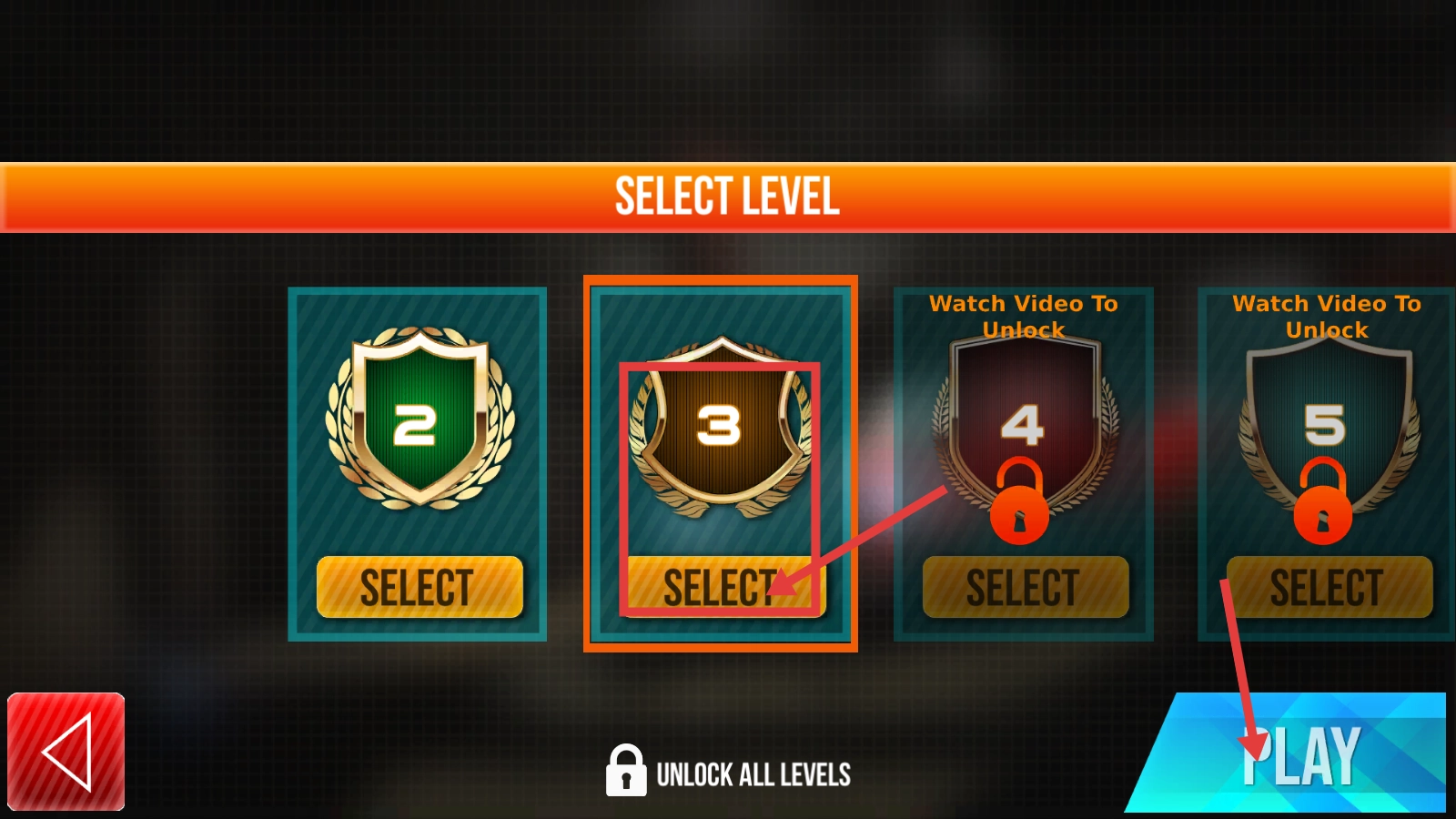 在【SELECT-LEVEL】界面点击【等级3】对应的【SELECT】按钮,接着点击【PLAY】,即可开启机器人战斗关卡的挑战。