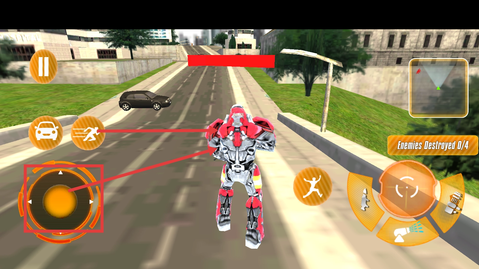 通过左侧轮盘操控机器人移动,借助技能按钮辅助,在城市道路场景中做好迎战敌人的准备。