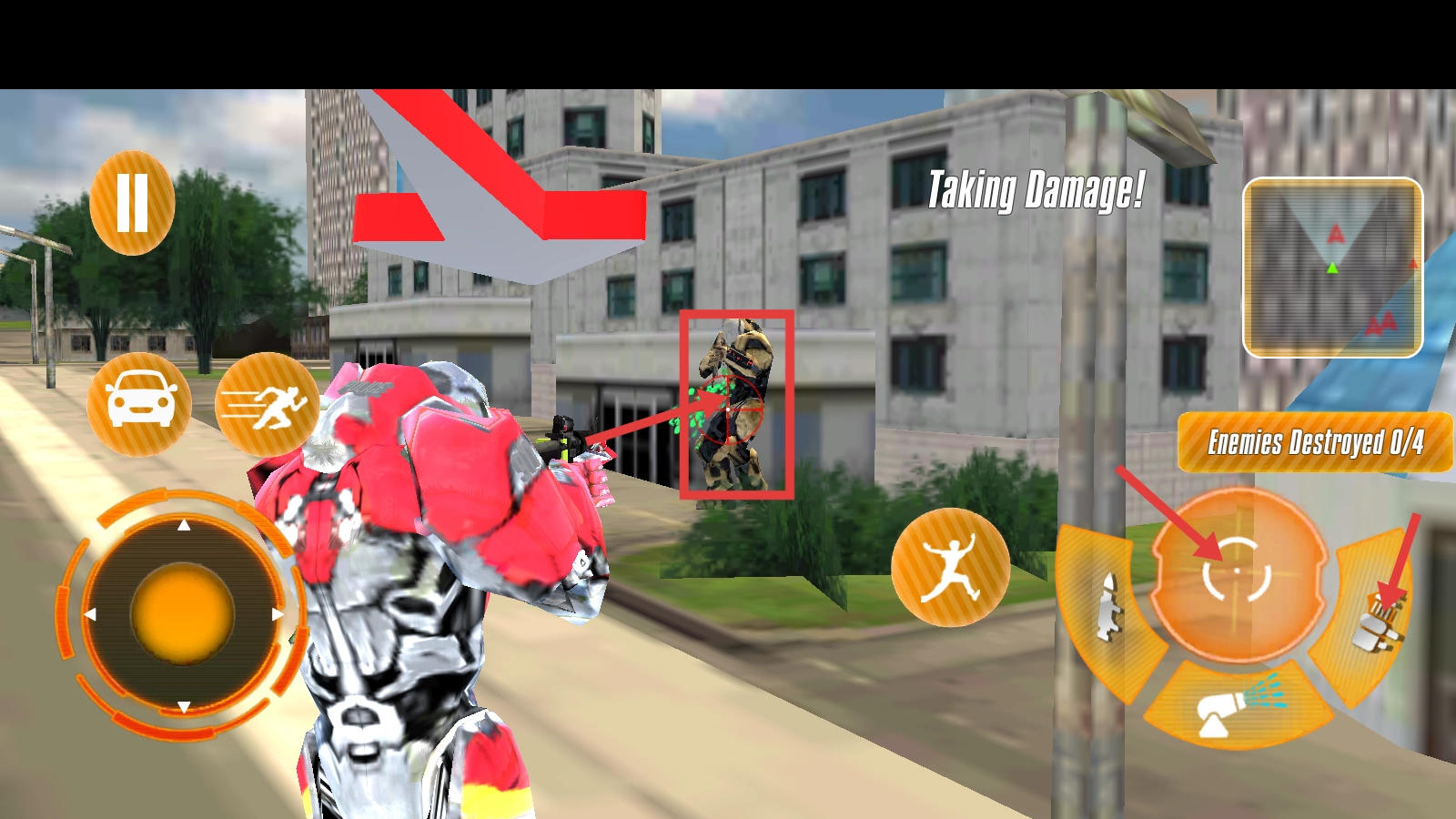 发现敌方机器人后,点击右侧的攻击按钮进行攻击,留意【Enemies-Destroyed-0/4】的杀敌进度,逐个消灭敌人。
